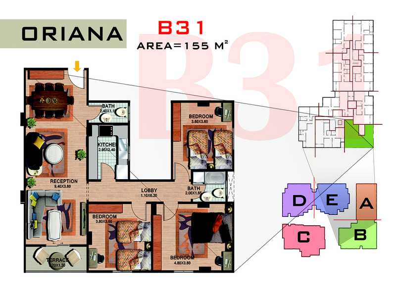 أوريانا كمبوند مقام على مساحة 1 فدان بما يقارب 4000 متر مربع تقريبا وهو مكون من 5 عمارات سكنية كومبلكس مختلفة ومتنوعة المساحات كما يحتوي بداخل العمارات السكنية على لاند سكيب داخلي بالكامل يطل عليه كافة الوحدات السكنية وتنقسم العمارات إلى 5 عمارات سكنية مكونة من ( أ ومكون من 4 شقق – ب مكون من 5 شقق – ج مكون من 6 شقق – د مكون من 5 شقق – ه مكون من 5 شقق ) ومساحات مختلفة تبتدأ من 103 متر حتى 164 متر مربع على أدوار تنقسم إلى بدروم ومخصص لجراجات محددة والدور الأرضي المنخفض مكون من محلات تجارية ووحدات سكنية بنفس مستوى اللاند سكيب والدور الأرضي المرتفع يتكون من محلات تجارية ووحدات سكنية بأعلى من مستوى اللاند سكيب أما باقي الأدوار مكونة من 5 أدوار كلها سكنية وتطل على اللاند سكيب والشوارع الخارجية.