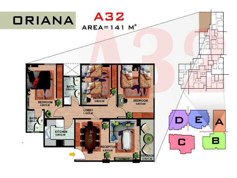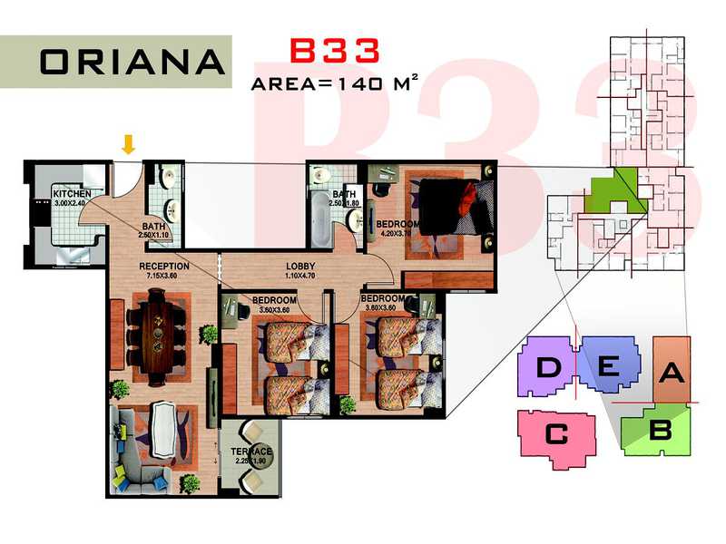أوريانا كمبوند مقام على مساحة 1 فدان بما يقارب 4000 متر مربع تقريبا وهو مكون من 5 عمارات سكنية كومبلكس مختلفة ومتنوعة المساحات كما يحتوي بداخل العمارات السكنية على لاند سكيب داخلي بالكامل يطل عليه كافة الوحدات السكنية وتنقسم العمارات إلى 5 عمارات سكنية مكونة من ( أ ومكون من 4 شقق – ب مكون من 5 شقق – ج مكون من 6 شقق – د مكون من 5 شقق – ه مكون من 5 شقق ) ومساحات مختلفة تبتدأ من 103 متر حتى 164 متر مربع على أدوار تنقسم إلى بدروم ومخصص لجراجات محددة والدور الأرضي المنخفض مكون من محلات تجارية ووحدات سكنية بنفس مستوى اللاند سكيب والدور الأرضي المرتفع يتكون من محلات تجارية ووحدات سكنية بأعلى من مستوى اللاند سكيب أما باقي الأدوار مكونة من 5 أدوار كلها سكنية وتطل على اللاند سكيب والشوارع الخارجية.
